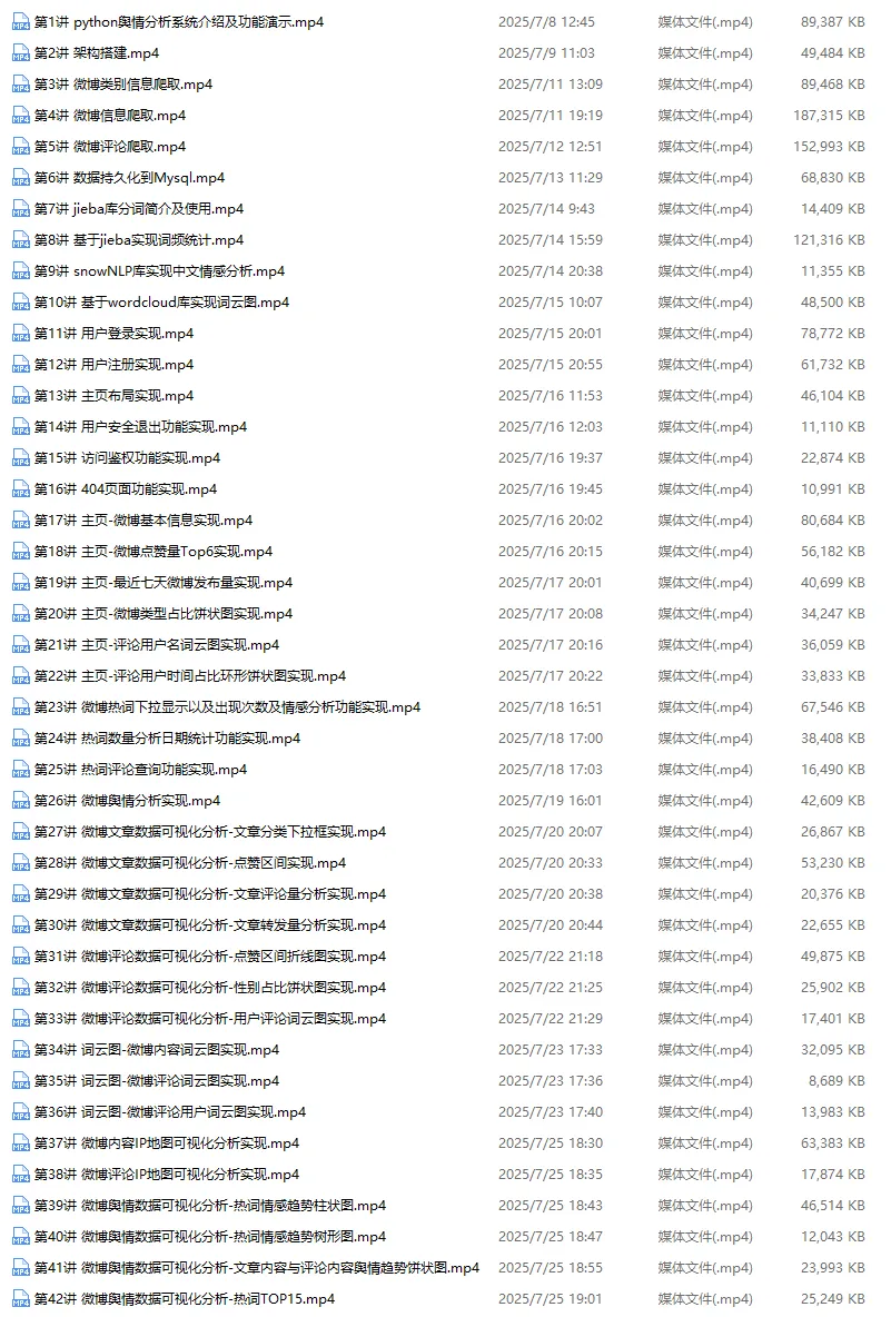 第三套VIP实战:【NLP舆情分析】基于python微博舆情分析可视化系统(flask+pandas+echarts+爬虫) 视频教程,42讲 已经更新完结!质量杠杠的,好评多多!