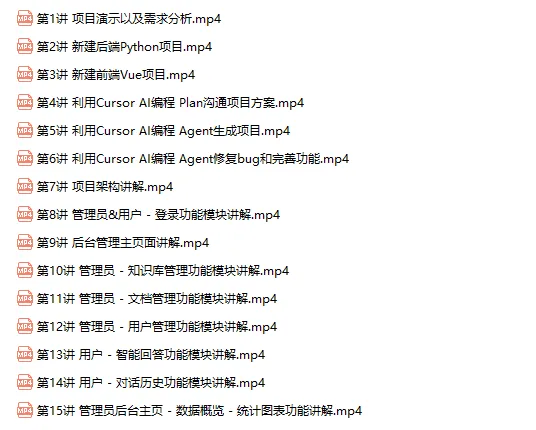 本课程主要结合AI编程 Cursor 实现一个 基于LangChain的RAG企业内部知识库问答Agent系统。讲解内容包括需求分析,新建后端Python项目以及前端Vue项目,利用Cursor AI编程实现Plan沟通项目方案,Agent生成项目,Agent修复bug和完善功能。