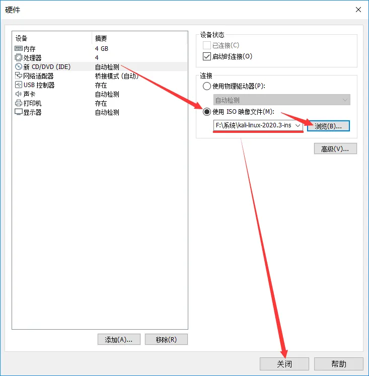 - 点击 "浏览" 选择下载好的 Kali ISO 文件