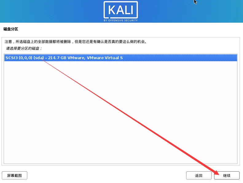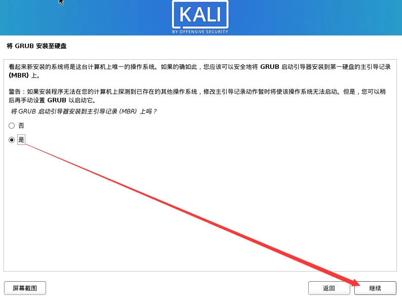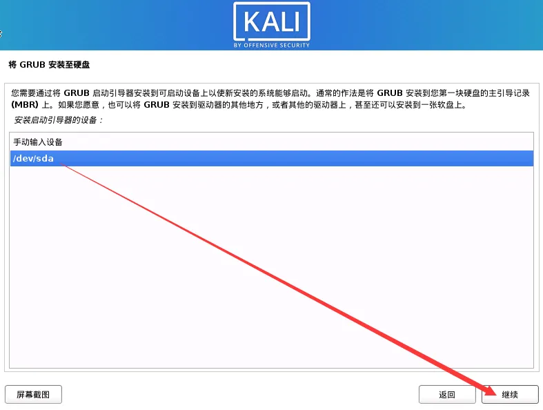 选择将 GRUB 安装到的磁盘(通常为 /dev/sda),点击 "继续"