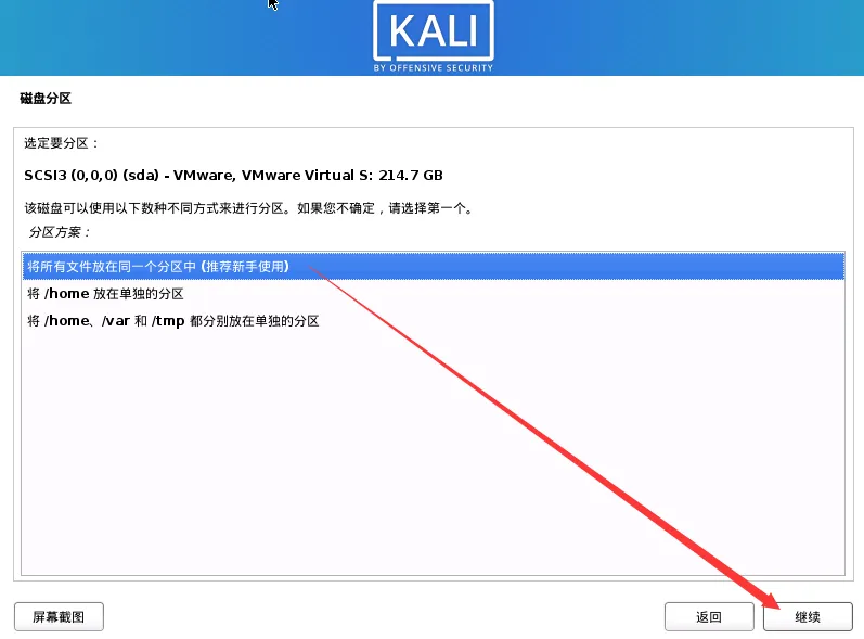 选择 "将所有文件放在同一个分区中"(推荐新手使用),点击 "继续"