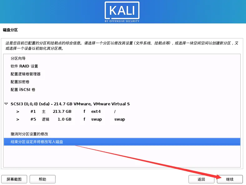 检查分区配置,确认无误后选择 "结束分区设定并将修改写入磁盘",点击 "继续"