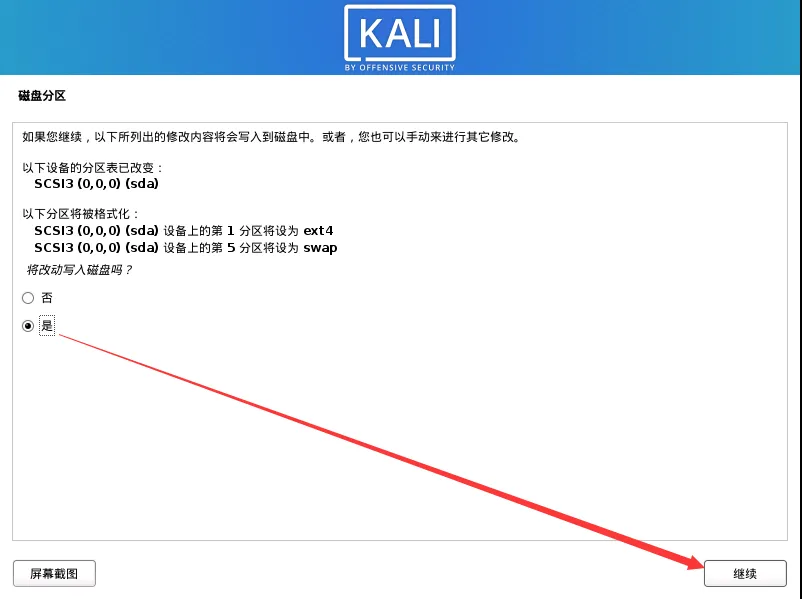 选择 "是" 将修改内容写入磁盘,点击 "继续"