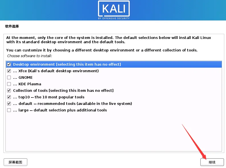 在 Kali 2020 版本中,官方说明可以进行离线安装(不需要连网),但仅限于默认勾选的包。如果勾选了其他软件包组,系统会尝试联网下载,由于国内网络较慢,可能导致安装失败。