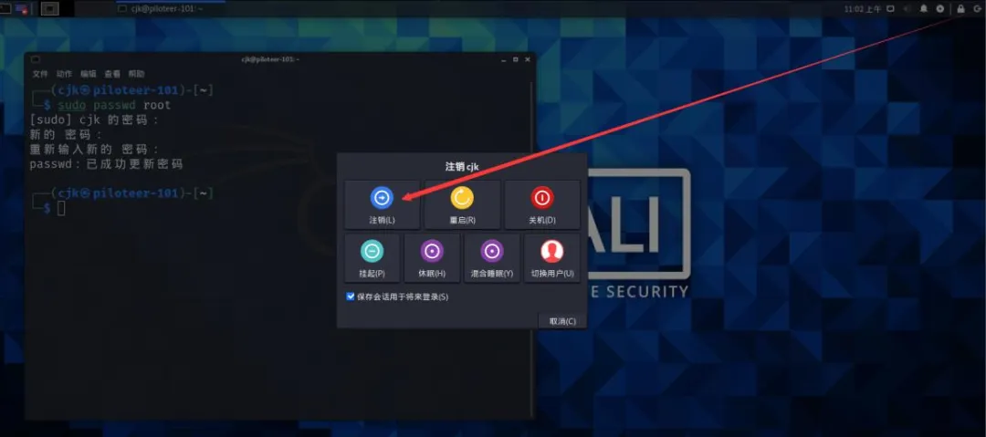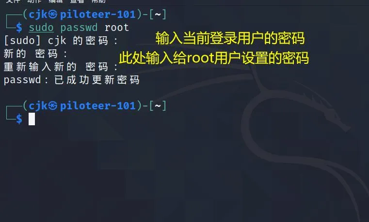 [sudo] xxx的密码: # 输入当前用户的密码新的密码: # 输入要设置的root密码重新输入新的密码: # 确认密码passwd: 已成功更新密码