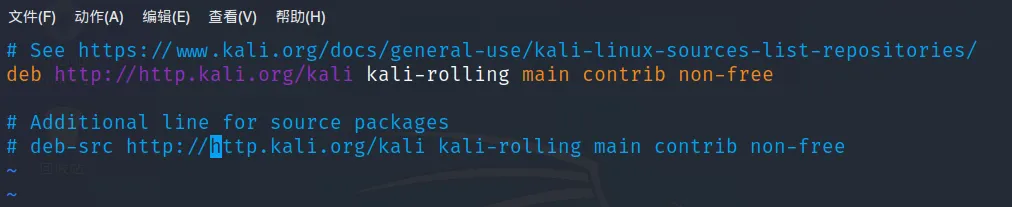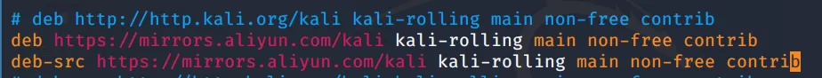 # 阿里云镜像源deb https://mirrors.aliyun.com/kali kali-rolling main non-free contribdeb-src https://mirrors.aliyun.com/kali kali-rolling main non-free contrib