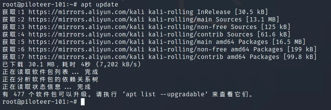 # 更新软件源apt update# 升级系统apt upgrade -y# 更新Kali工具集apt dist-upgrade -y