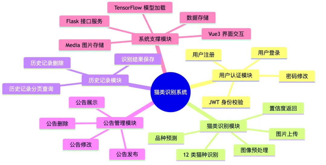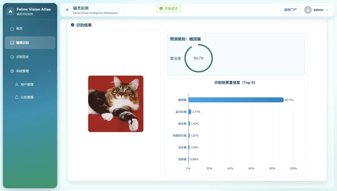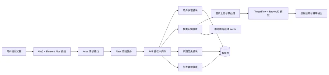 基于深度学习的猫类识别系统,识别类别包括伯曼猫、俄罗斯蓝猫、埃及猫、孟买猫、孟加拉猫、布偶猫、斯芬克斯猫、暹罗猫、波斯猫、缅因猫、英国短毛猫和阿比西尼亚猫共 12 类。系统以前后端分离方式实现,前端采用 Vue3 与 Element Plus 构建交互界面,后端基于 Flask 框架提供用户认证、图像上传、品种识别、历史记录管理和公告管理等接口服务,算法部分使用 TensorFlow 搭建并加载 ResNet50 模型完成图像分类任务。用户登录后可上传猫咪图片,系统会返回预测类别、识别置信度及各类别概率排序结果,并自动保存识别历史,方便后续查看与管理。
