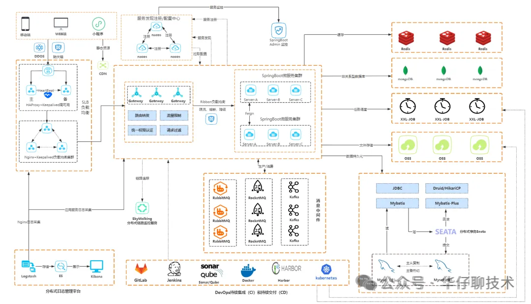 技术架构涵盖了 SpringBoot 2.6、SpringCloudAlibaba、Nacos 3.0、Sentinel、Skywalking、RocketMQ 5.x、ElasticSearch 7.9.x、Redis 7.x、MySQL 8.x、XXL-Job、Redisson 等技术: