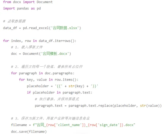这段代码做了三件事:读取数据、替换文本、保存文件。它循环处理数据表中的每一行,为每个客户生成一份独立的合同。生成的文件名可以包含客户和日期,便于后续管理。