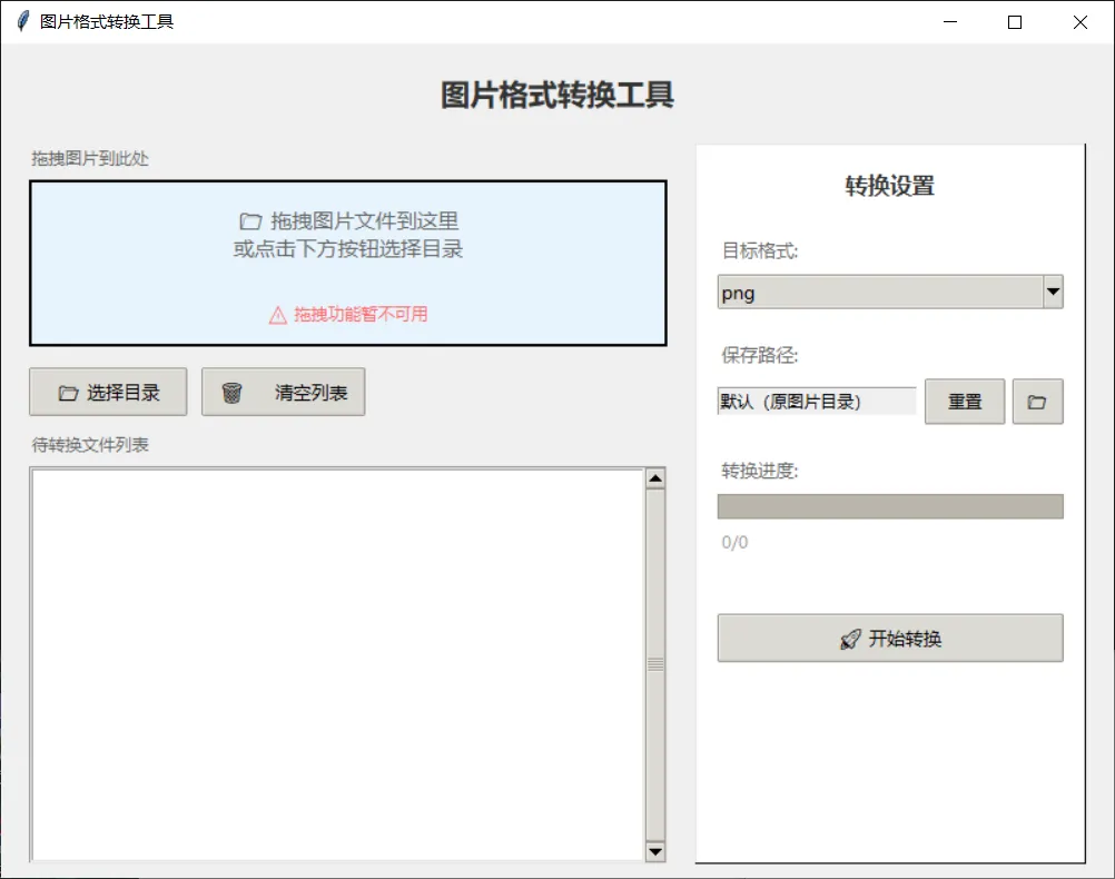 # 格式下拉框self.format_combobox = ttk.Combobox(format_frame, textvariable=self.format_var, values=['jpg', 'png', 'webp', 'bmp'], state='readonly', font=('微软雅黑', 10))self.format_combobox.set('png')# 输出路径self.output_path = tk.StringVar()self.output_path.set('默认(原图片目录)')state='readonly' 防止用户手动输入非法格式defsetup_drag_drop(self):try:from tkinterdnd2 import DND_FILES, TkinterDnDself.drop_frame.drop_target_register(DND_FILES)self.drop_frame.dnd_bind('<<Drop>>', self.drop_files)except (ImportError, AttributeError):# 优雅降级:未安装拖拽库时显示提示 drop_label = tk.Label(self.drop_frame, text='⚠️ 拖拽功能暂不可用', bg='#e8f4fd', fg='#ff6b6b')设计亮点——优雅降级: