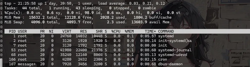 如图所示,上半部分表示当前时刻整体的资源利用情况,下班部分则是各个进程的资源占用情况以及命令行参数