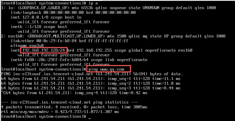 vi /etc/NetworkManager/system-connections/ens160.nmconnection [ipv4]method=manualaddress1=192.168.192.128/24dns=223.5.5.5;114.114.114.114gateway=192.168.192.2may-fail=false