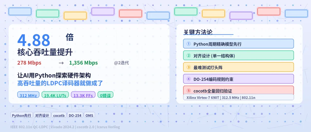 上篇文章(《用 AI 在 FPGA 上自主实现一个 LDPC 译码器的全记录》)里,迭代了 23 个版本,时序收敛了,面积压下来了,但吞吐量始终上不去 - 278 Mbps (R=1/2 @2 迭代,1,089 周期/帧), 离目标差了 4.5 倍。