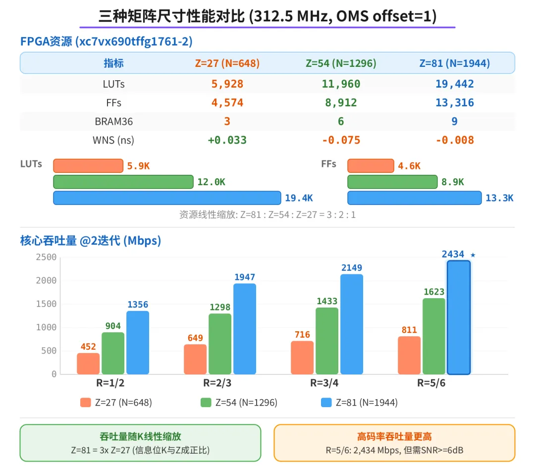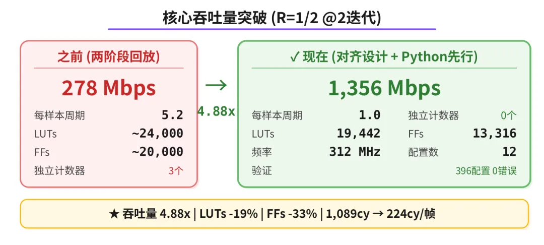 上次用了几百万 token, 吞吐量纹丝不动。这次方法论对了,用更少的 token 量,核心吞吐量从 278 提到1,356 Mbps (R=1/2 @2 迭代), 4.88 倍, 资源还更少了。