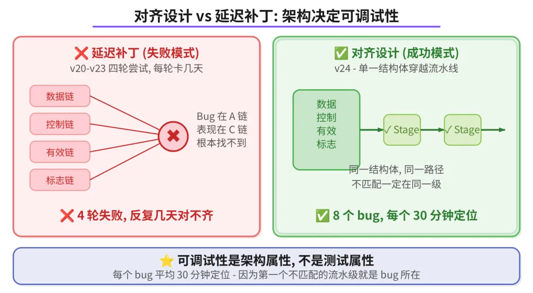 之后四轮尝试(v20-v23)切换到流式流水线,全部失败。v20 用了 3 个独立计数器,改一个错两个;v22 猜了延迟深度,差了 6 个周期;v23 做了 17 个模块 41 个单元测试全过,但集成以后差一拍,定位不到。