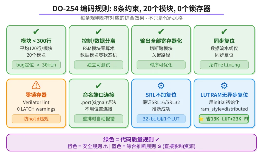 这些规则不只是代码风格。模块<300 行直接决定了 bug 能在 30 分钟内定位;输出寄存器化方便分模块做时序优化和 Debug 定位问题;LUTRAM 不加异步复位省了13K LUT + 23K FF。编码规范直接影响综合结果。