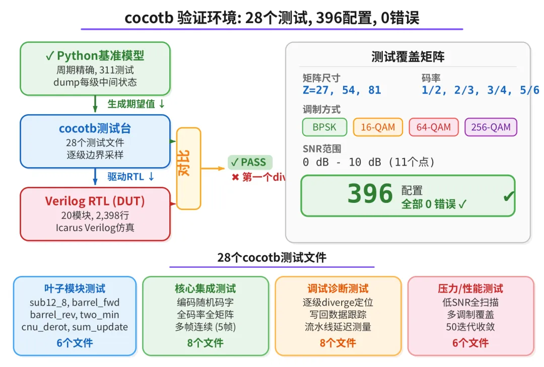 最后用 cocotb 跑了396 个配置(3 种矩阵尺寸 x 4 种码率 x 3 种调制 x 11 个 SNR), 全部 0 错误。