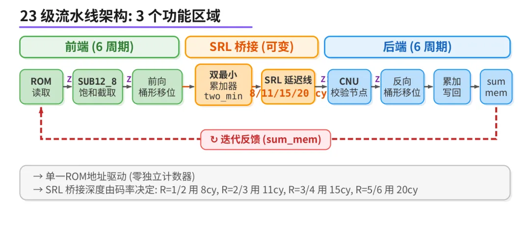 流式 LDPC 流水线的正确做法是"单一地址驱动": H 矩阵的所有非零元素按行主序存在 ROM 里,FSM 只做一件事 - 每拍递增 ROM 地址,读出一个条目,送进流水线。行边界、迭代边界、列地址,全部从 ROM 数据里提取,不需要额外的行计数器或列计数器。整条流水线只有这一个计数器。