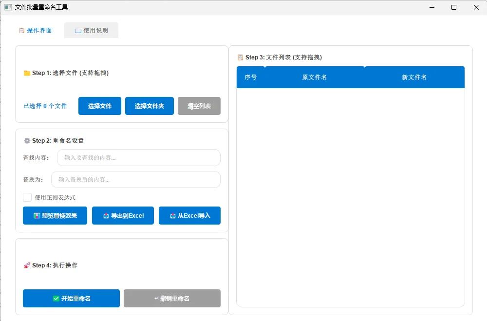 **功能描述**:文件重命名工具,支持批量重命名文件,可基于规则、模板或Excel数据进行命名,适用于文件管理和整理。