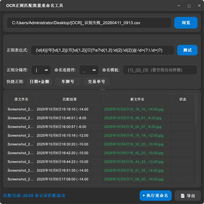 **功能描述**:对UmiOCR识别的结果文件(CSV)根据识别结果进行正则提取,进而实现文件重命名。