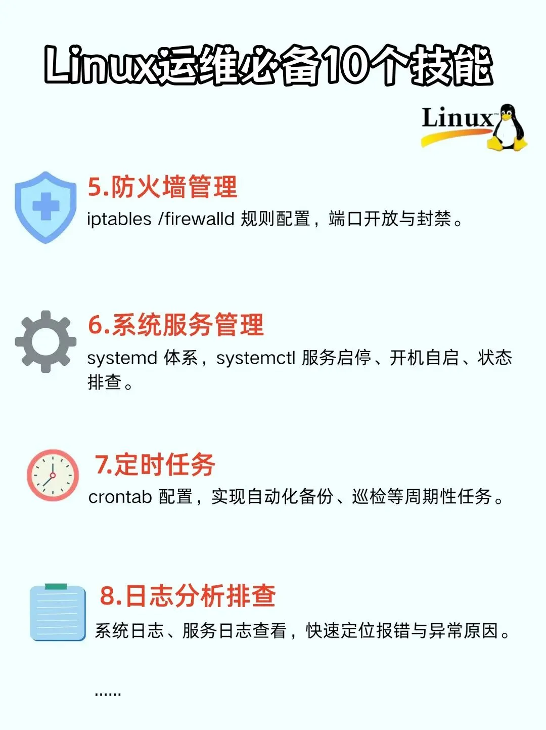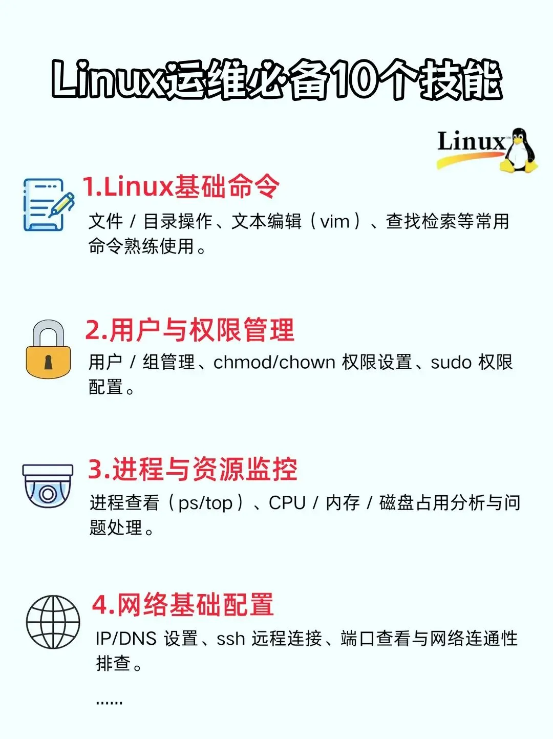 以下是Linux运维必备的基本技能,按知识领域分类,帮助你构建完整的能力体系。