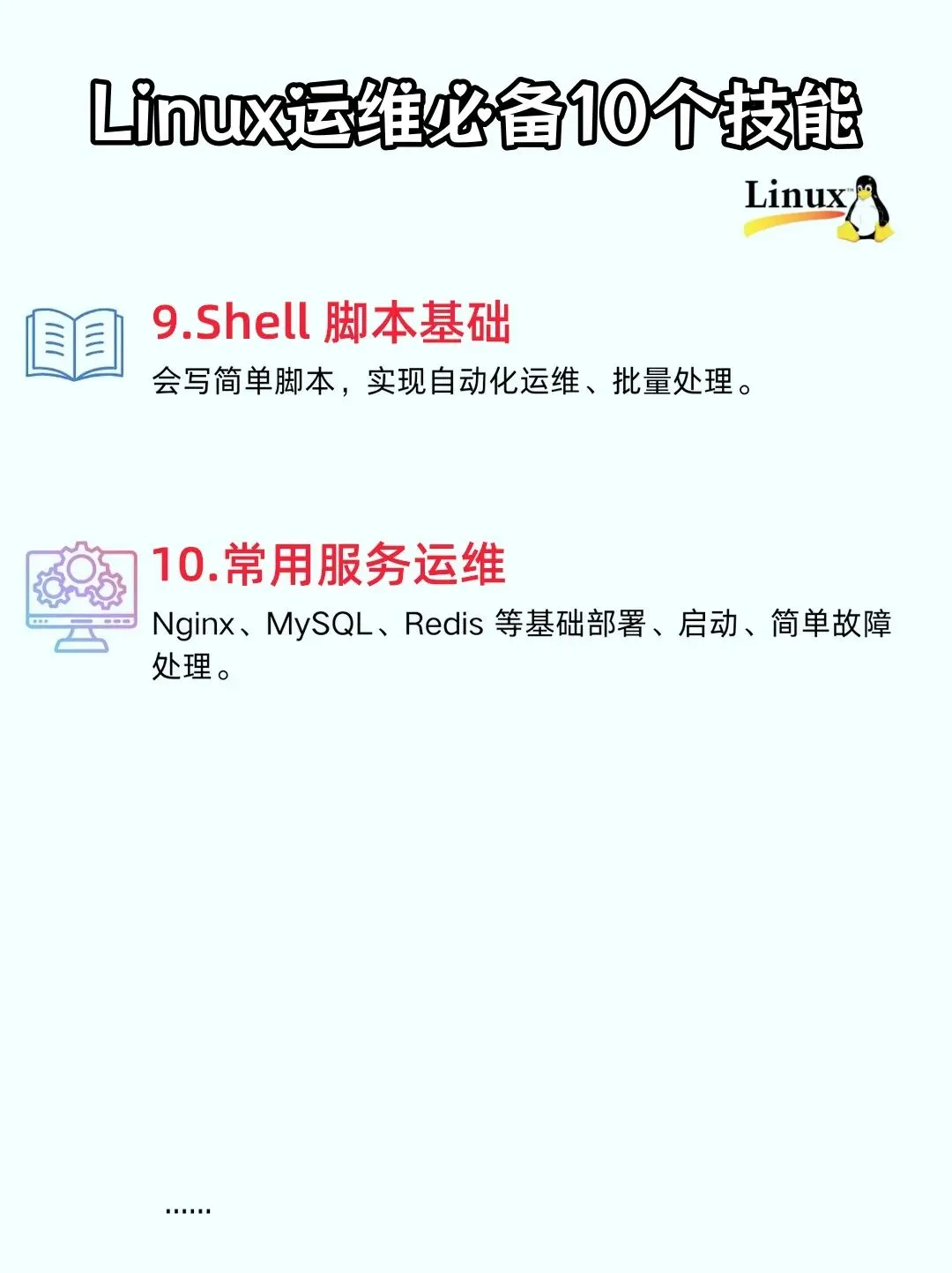 这些技能是Linux运维工程师的必备武器,需要在工作中不断实践和积累。遇到问题多动手、多思考,逐步从“会用工具”进阶到“理解原理”。