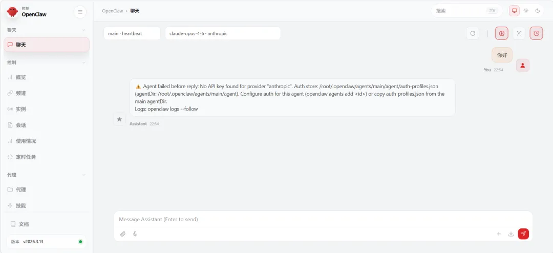 我们在聊天界面随便发一句话,我们会看到失败,这是因为我们还没有配置模型: