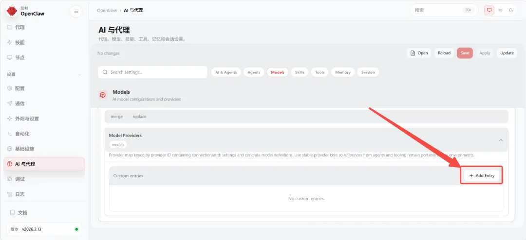 点击左侧「AI与代理」→「Models」→「Add Entry」开始添加一个新的供应商: