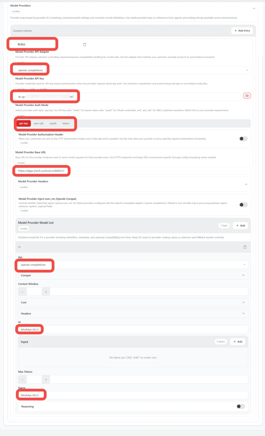 我在写这个记录时,联通云正好可以领一个月的Coding Plan,每月有 18000 次请求,所以这里就以联通云为例,只需要填写如下几个即可: