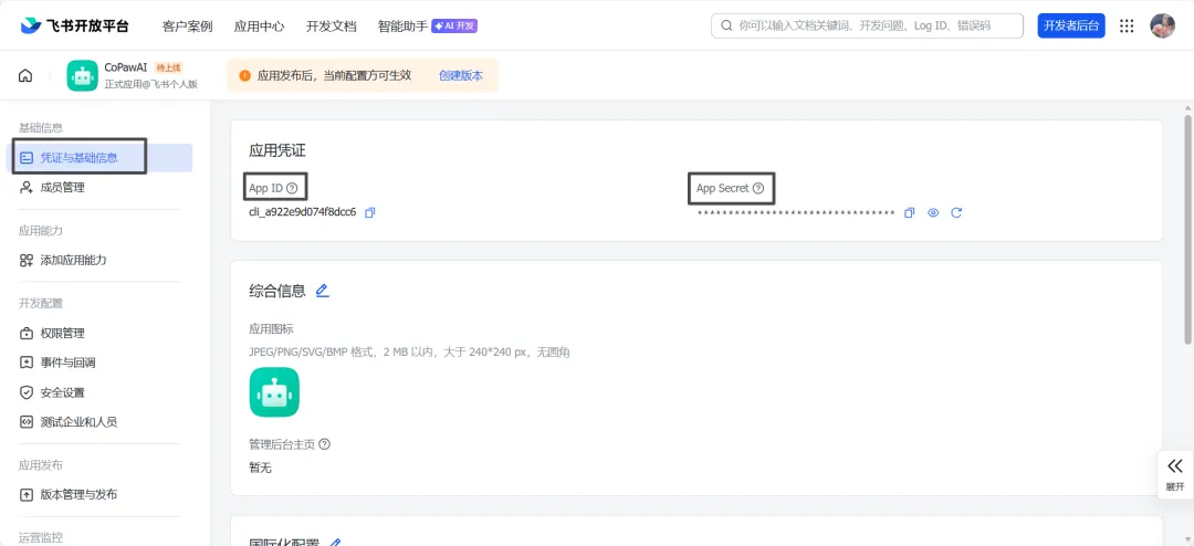 - 点击「创建」,成功后会自动进入应用管理页面,点击右侧「凭证与基础信息」中获取 App ID、App Secret