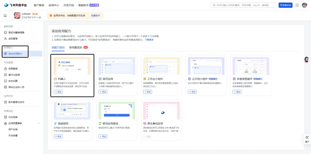 - 在应用管理页面左侧菜单,找到 「应用能力」→「添加应用能力」→「机器人」;