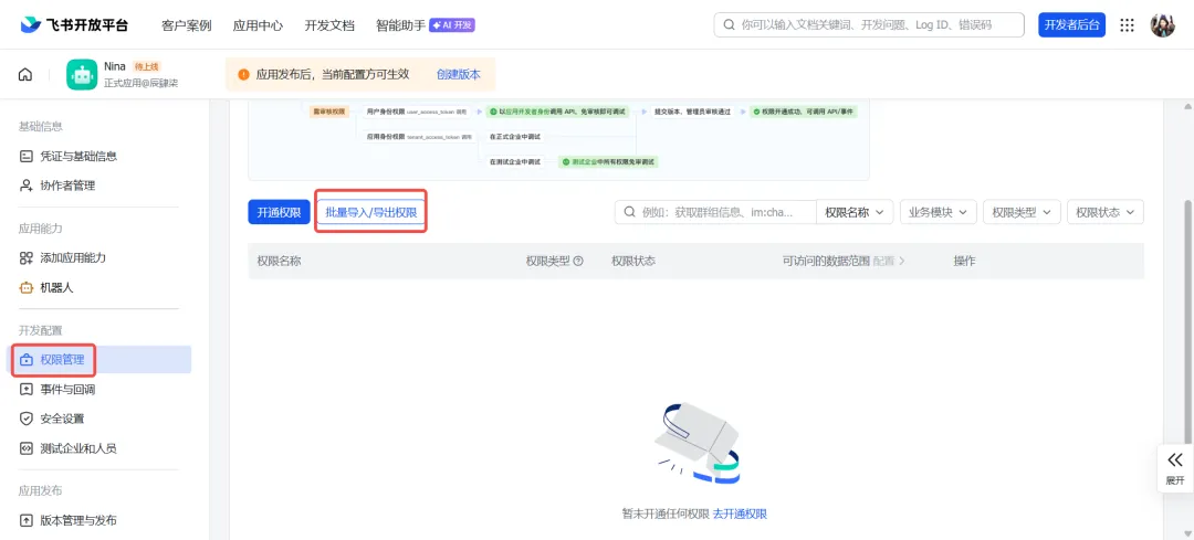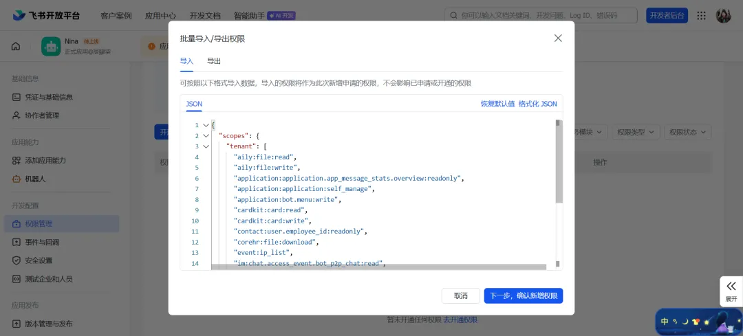 选择「权限管理」中的「批量导入/导出权限」,将以下JSON代码复制进去: