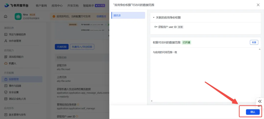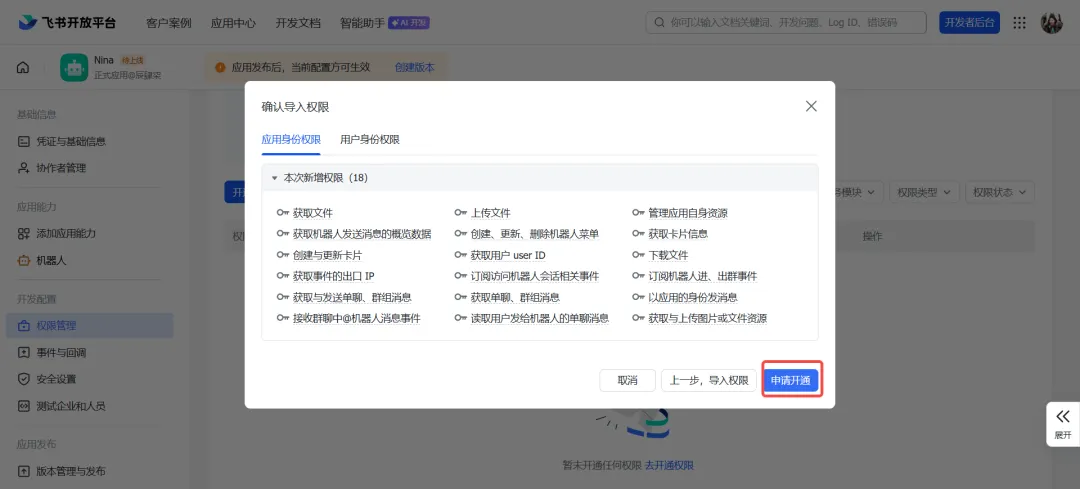 不添加权限,机器人收不到消息,务必操作!