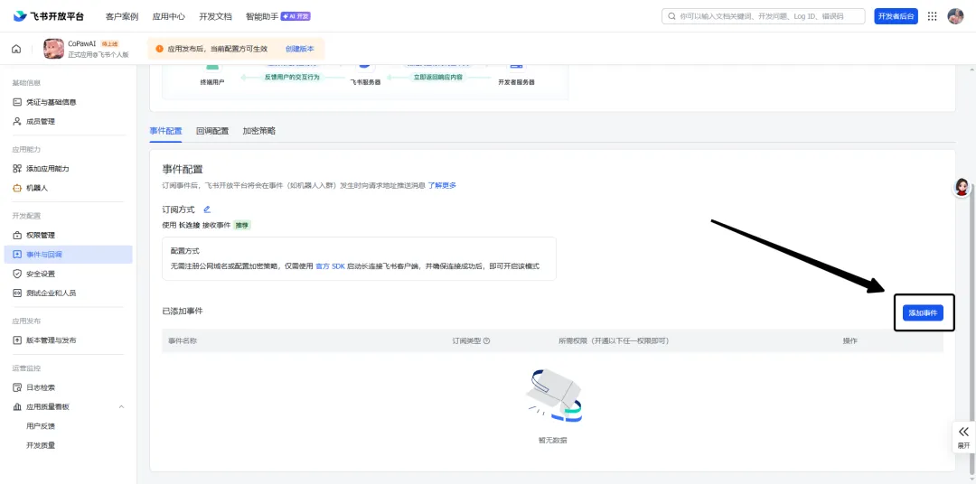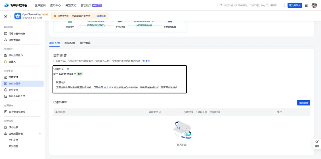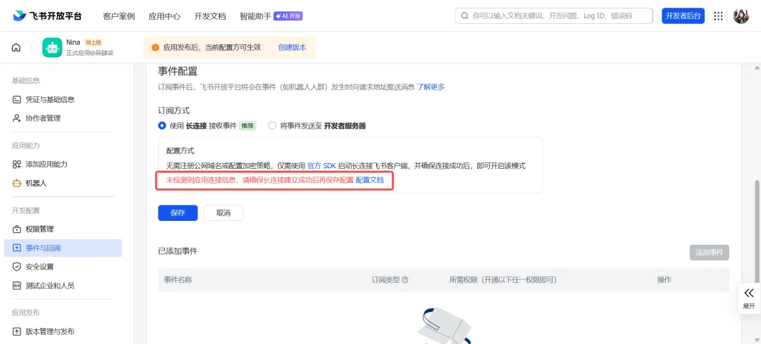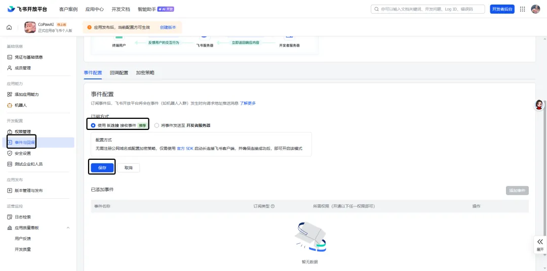 现在再去飞书开放平台中的事件与回调→事件配置中使用长链接保存试试呢~