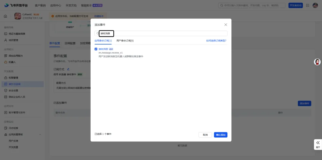 选择「添加事件」 ,搜索“接收消息”,订阅接收消息 v2.0: