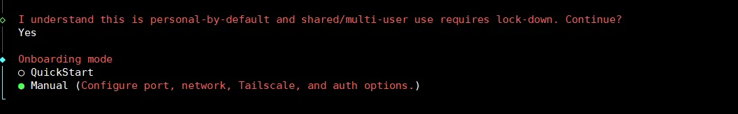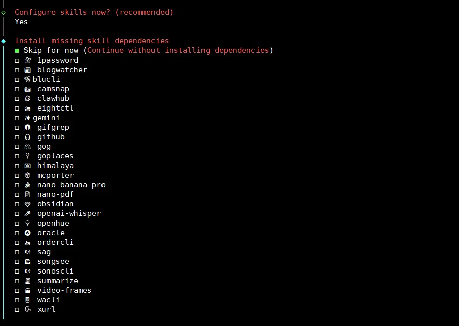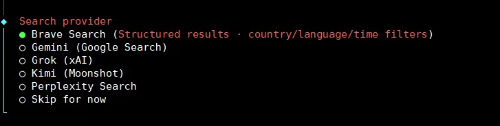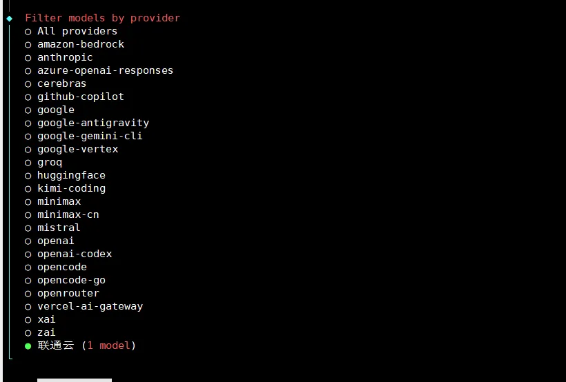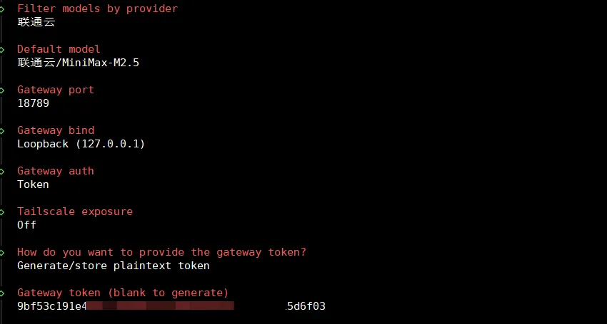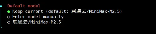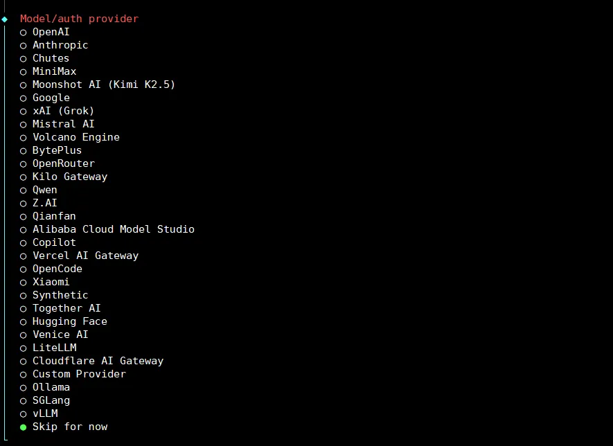 这是选择模型的提供商,并配置api key,本文使用的是自定义的联通云的api,因此我选择Skip for now,你可以根据需求来~