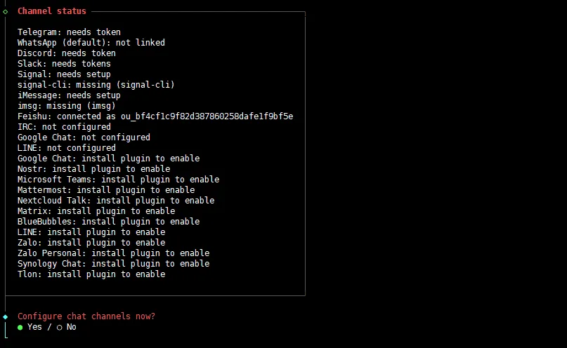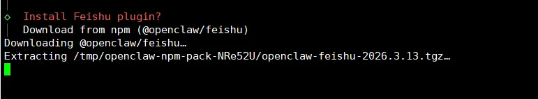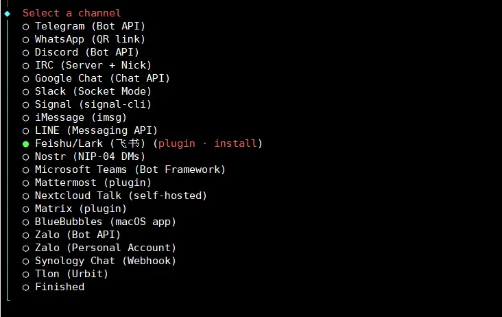 选择你想配置的频道,这里我们选择「飞书」,会自动安装插件: