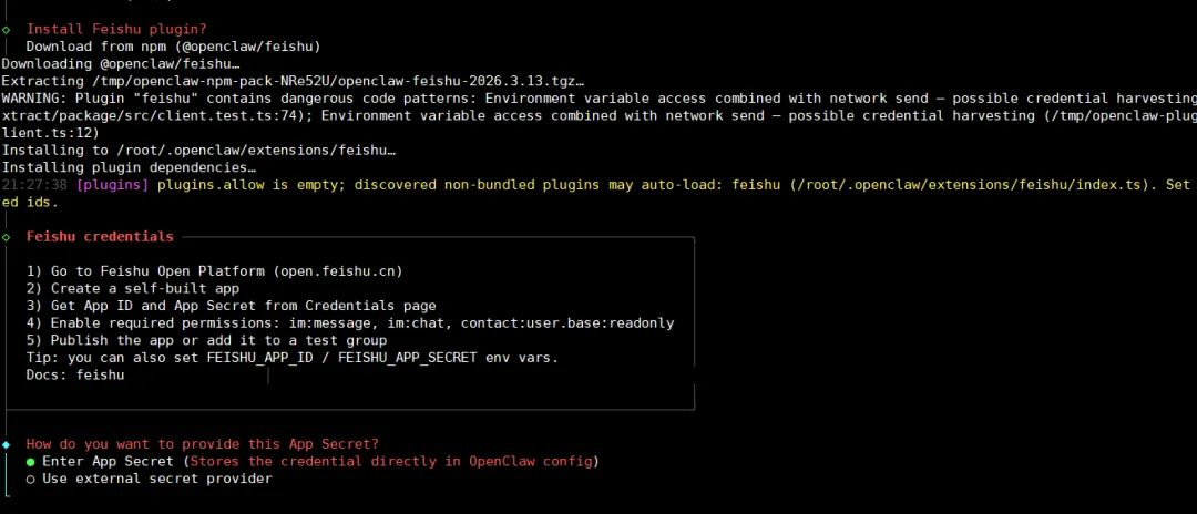 下载完成后,第一个选项的意思是配置「飞书」 的 App ID 与 App Secret,还记得在第 3.2节 让你保存的两个变量吗,就是他们,没保存也没关系,去3.2节找一下: