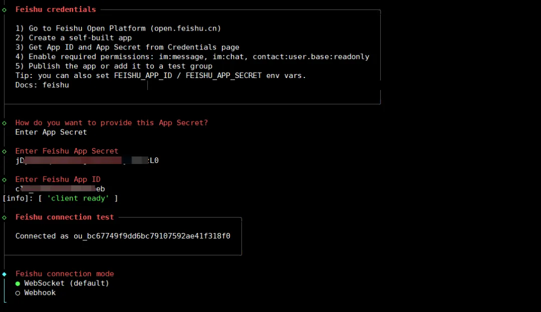 - 连接模式(Feishu connection mode)WebSocket (default):默认采用 WebSocket 长连接方式,用于实时接收飞书事件与消息推送,适合需要低延迟交互的场景。这就是你上面错误的地方奥。