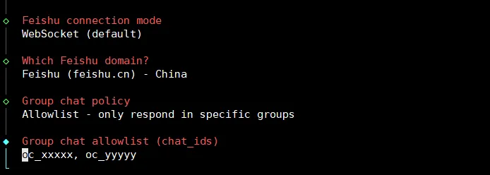 - 群聊白名单(Group chat allowlist (chat_ids))已配置示例:oc_xxxxxx, oc_yyyyy 格式说明:以逗号分隔的飞书群聊 ID(chat_id)列表,机器人仅会对这些群内的消息做出回应。如果机器人需要放入群里面,就在这里配置。