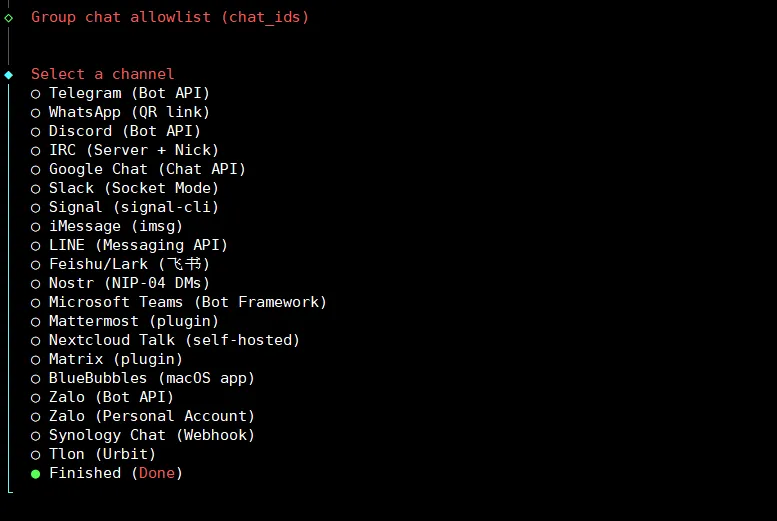 我们已经配置过「飞书」,并且只准备配置一个,选Finished即可: