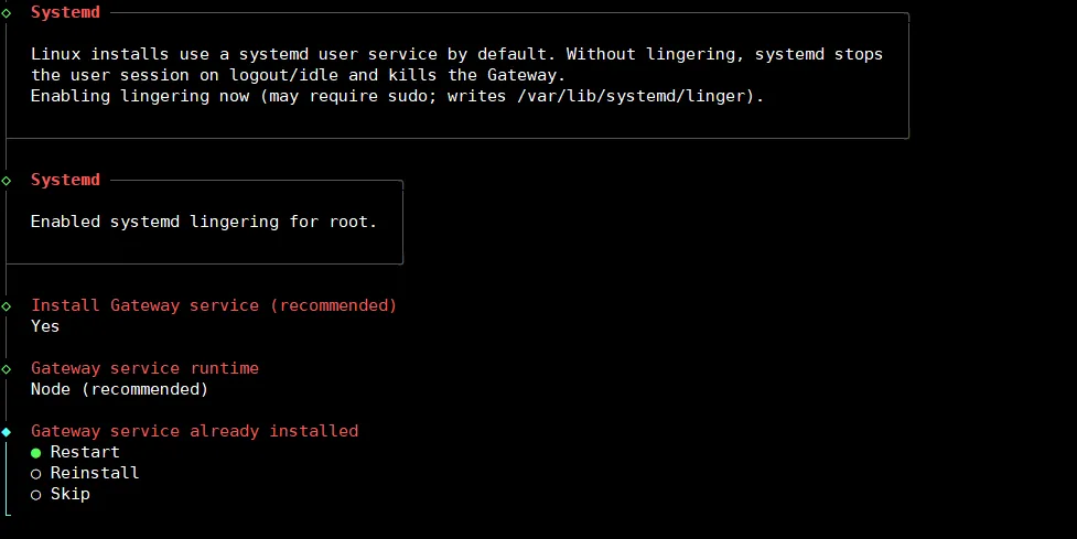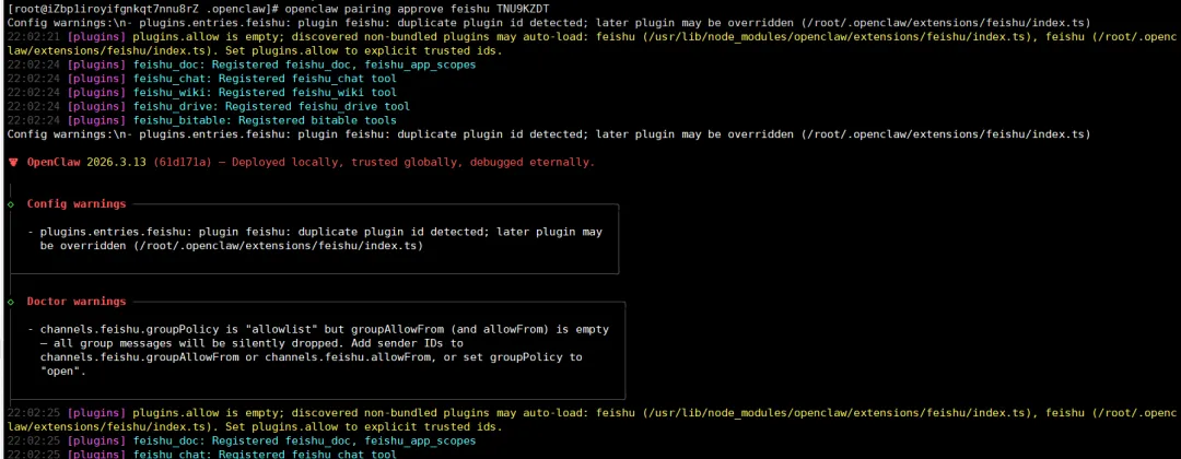 [root@iZbp1iroyifgnkqt7nnu8rZ .openclaw]# openclaw daemon restart🦞 OpenClaw 2026.3.13 (61d171a) — iMessage green bubble energy, but for everyone.Restarted systemd service: openclaw-gateway.service