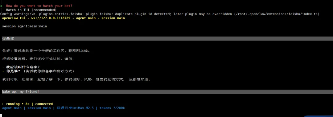 此处选择了「Hatch in TUI (recommended)」 启动了一个界面,这其实就是命令行样式聊天框,内容是不是很熟悉,就是我们在网页聊天的内容~