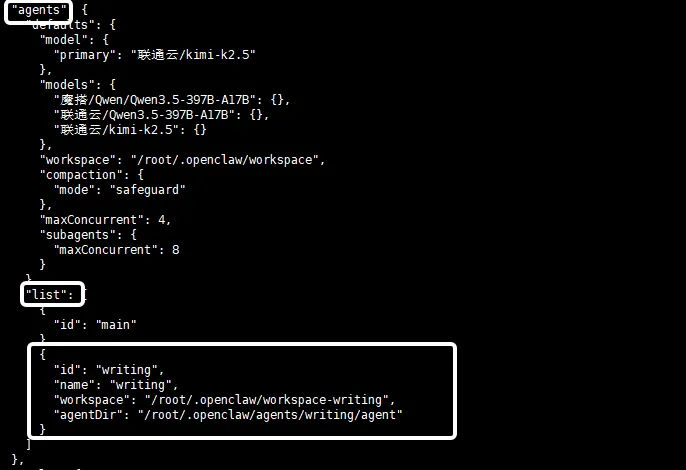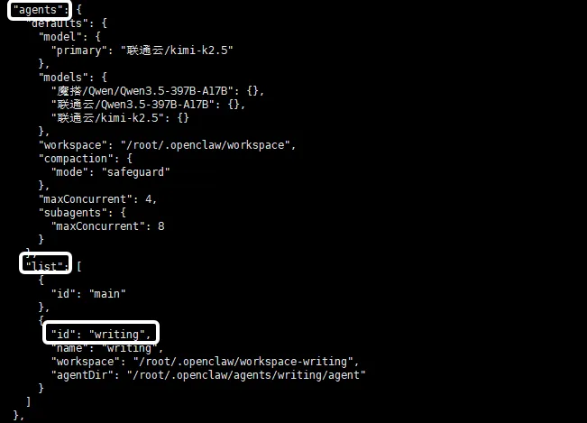 我们在配置文件中找到agents→list,可以看到新增了刚刚我们创建的智能体Writing的相关配置~