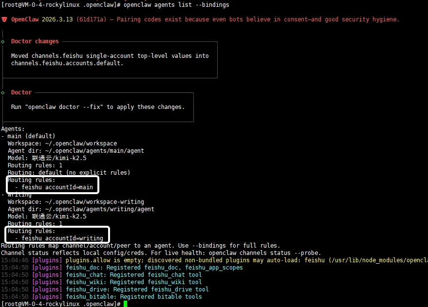"bindings": [ {"agentId": "main","match": {"channel": "feishu","accountId": "main" } }, {"agentId": "writing","match": {"channel": "feishu","accountId": "writing" } }]