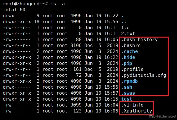 以.开头白色字体显示的是隐藏文件, 以.开头蓝色字体显示的是隐藏目录