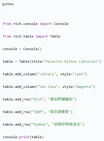 运行这段代码,你的终端会立刻变成一个信息展示板!Rich支持语法高亮、Markdown渲染、进度条等,让你调试和展示数据成为一种享受。
