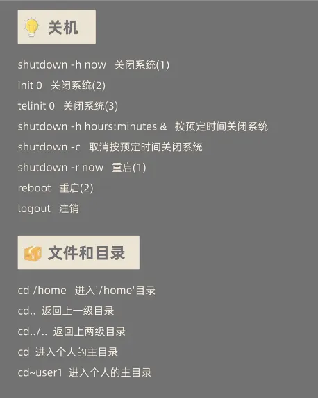 m:删除文件-i:交互确认;-r:递归删除目录;-f:强制删除例:rm -rf testmkdir:创建文件夹-p:连续创建多级目录,如 mkdir -p dir1/dir2