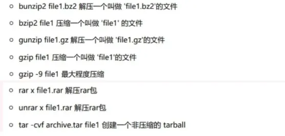tar:打包:tar -cvf out.tar 文件解包:tar -xvf out.tar打包并gzip压缩:tar -czvf backup.tar.gz /etc解压:tar -xzvf foo.tar.gzgzip:压缩文件 gzip test.txt